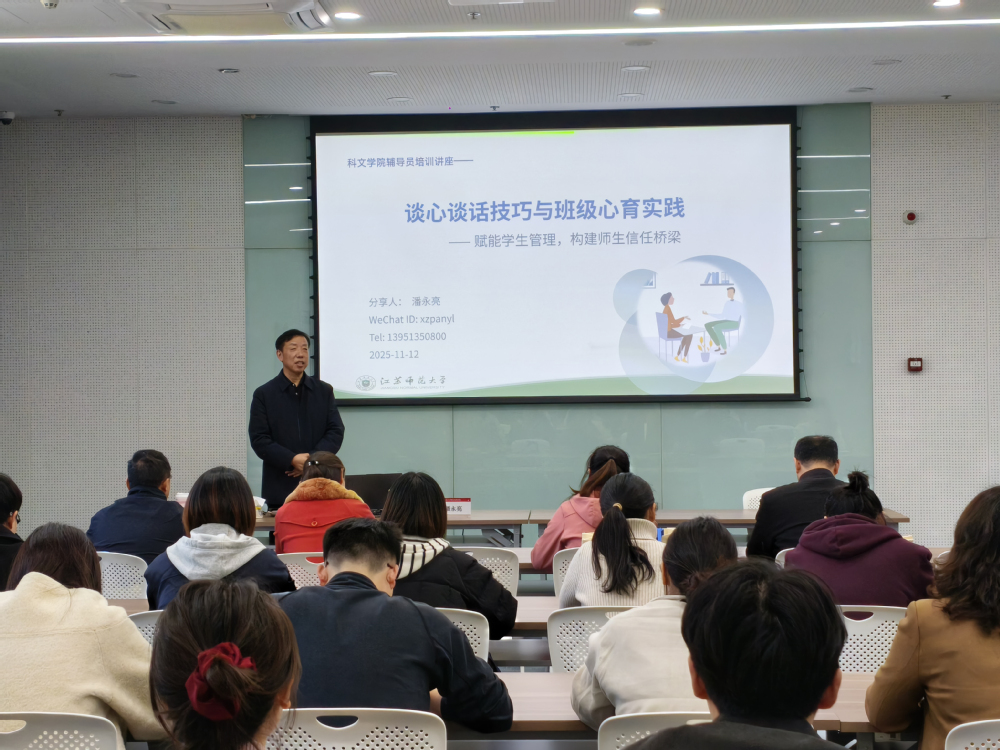 为落实立德树人根本任务,推进“育德与育心相融合”工作要求,提升辅导员心理育人能力,构建温情师生成长共同体,学生工作部特邀江苏省总工会职工心理健康教育特聘研究员、硕士生导师潘永亮老师,于11月12日下午在明志楼四楼会议室为辅导员们开展 “谈心谈话技巧与班级心育实践” 专题培训。培训由学生工作部部长秦晓菁主持,全体辅导员参训。