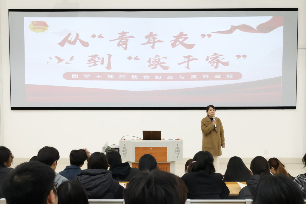 理论领航明方向。活动以《从“青年友”到“实干家”——团学干部的使命担当与实务赋能》为主题的理论培训开启。分团委书记王群深入阐释了新时代团学干部的角色定位,强调要“做青年友,不为青年‘官’”,并通过案例解析“青年友”的核心在于贴近同学、服务同学、凝聚同学。明确成为“实干家”所需的“四把金钥匙”,即项目策划与执行、组织协调与沟通、宣传与表达、应急处突与抗压能力,为团干部提供了清晰的工作方法论。