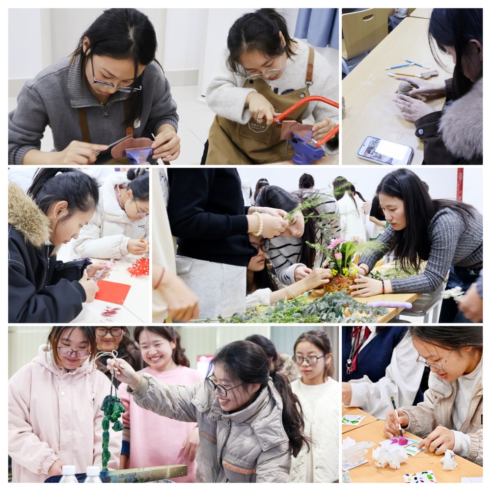 为保障课程专业性与实践性,学院精心组建优质师资团队。香包制作、植物扎染、剪纸艺术三大非遗类课程,特邀马庄香包工作坊非遗传承人亲临指导,带领学生触摸传统工艺温度;插花艺术与多肉黏土手工课程,由生命科学学院专任教师负责,为学生提供专业理论教学与实操技能指导;创意木工课程由江苏润势文化研究院专业木工教师授课,系统传授标准化木工技艺;陶瓷艺术课程则邀请岐山凤窑陶艺师徐道琴担任主讲,解锁陶瓷拉坯、上釉等核心技能。