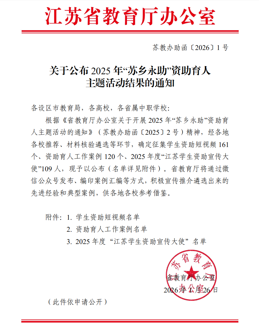 近日,江苏省教育厅公布了2025年“苏乡永助”资助育人主题活动评选结果,我院推荐的学生资助短视频《资助政策三句半》《“资”此青绿》入选优秀作品,2024级学生钱永佳获评2025年度“江苏学生资助宣传大使”。