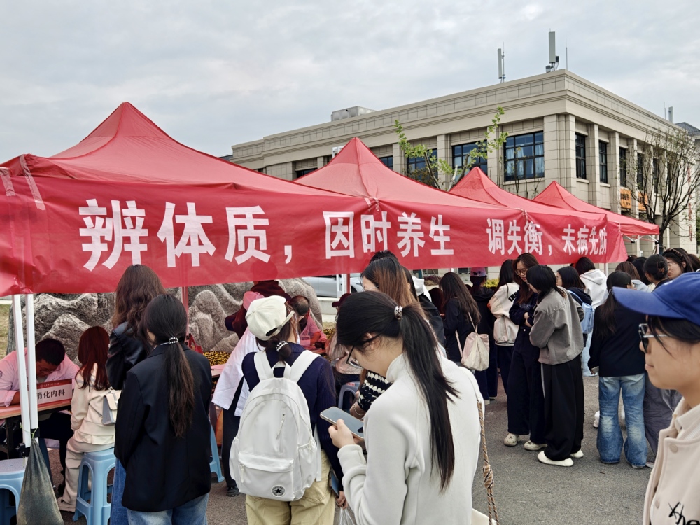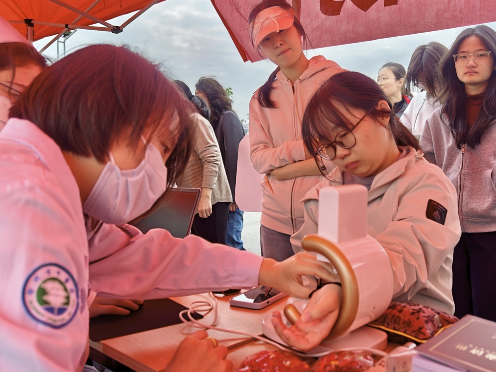 上午9:30,思齐广场的义诊活动准时启动。来自内分泌科、皮肤科、心血管科等10个科室的专家为师生提供“一对一”服务,涵盖中医体质辨识、脉诊咨询及常见病防治指导。现场特别设置了AI脉诊体验、针灸推拿等区域,让师生在体验传统中医疗法的同时,感受现代科技与传统医学的融合创新。专家们还发放了中医养生资料,普及“辨体质、因时养生”的健康理念。