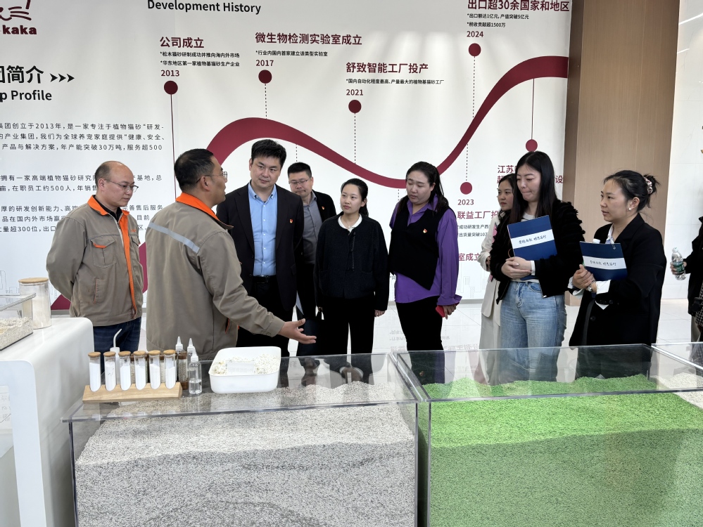 理论学习结束后,全体党员共同前往贾汪猫砂材料产业技术研究院实地参观学习。在呜咔咔集团副总经理解祥林的陪同讲解下,大家先后参观了产品展示区、研发实验室、生产工艺展示区,详细了解企业发展历程、技术研发创新、产业布局规划及人才需求情况,直观感受地方特色产业发展势头与技术创新活力。