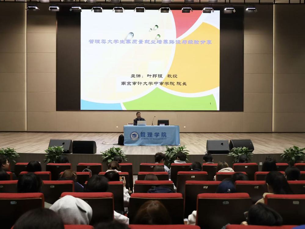 为助力学生明晰职业规划、提升就业竞争力,4月22日下午,管理学院特邀南京审计大学中审学院院长叶邦银教授,开展题为“管理类大学生高质量就业培养路径与经验研究”的专题讲座。党总支书记庄建锋、学工办全体教师及220余名学生共同参与,讲座由院长李锦生主持。