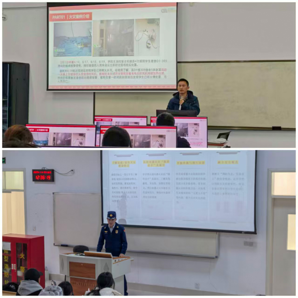 学院创新宣传载体,实现消防安全教育全覆盖。通过学院网站、电子屏、条幅等形式营造消防宣传月氛围。各班级集中开展“用火用电安全”主题班会,结合案例剖析、视频学习、互动问答等形式,引导学生杜绝私拉乱接电线、使用大功率电器等违规行为;后勤保障部及院内服务单位聚焦电动自行车充电、燃气使用、施工动火等重点领域,通过工作群、班前班后会推送安全常识,在集中充电区、食堂燃气阀等关键部位张贴警示标语;学院特邀贾汪区消防救援大队专家开展专题讲座,并组织师生代表赴贾汪区消防科普教育基地开展以“解锁蓝焰密码,筑牢青春防线”为主题的沉浸式消防安全实训活动,切实提升师生消防安全认知水平。