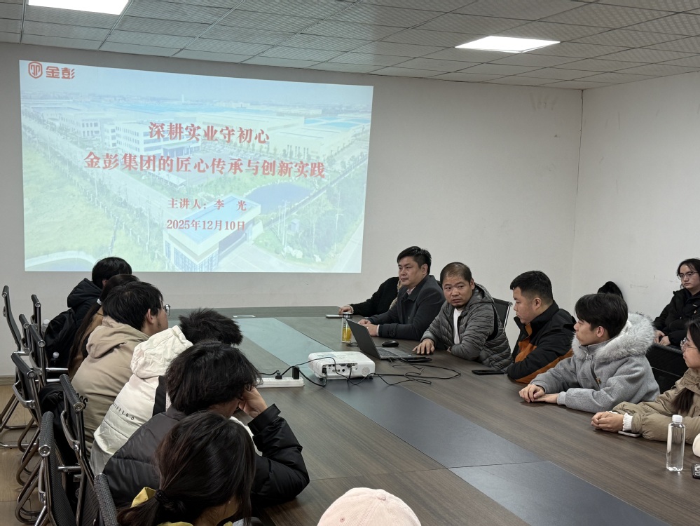 在智能化生产车间参观环节,全体人员认真观摩了自动化焊接设备与精密检测仪器的协同作业流程,实地考察了“省级智能制造示范工厂”建设成果。在专题讲座环节,江苏金彭集团有限公司电三产业平台制造中心副总经理、徐州市劳动模范李光同志以“二十年匠心坚守”为主题,分享了从普通技工成长为企业管理者的奋斗历程。李光表示:“作为党员,我始终牢记‘把产品做到极致’的初心使命,以‘踏实肯干、主动求索’的工匠精神践行入党承诺。”报告内容生动深刻,使在场师生深受启发,获益良多。