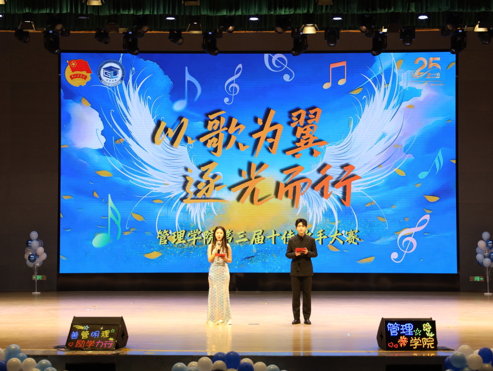 12月5日晚,管理学院“以歌为翼,逐光而行”第三届十佳歌手大赛决赛在风华楼举办。贾汪团区委副书记皇甫思阳及科文学院相关老师担任评委,管理学院分团委老师、辅导员及800余名师共赏这场视听盛宴。