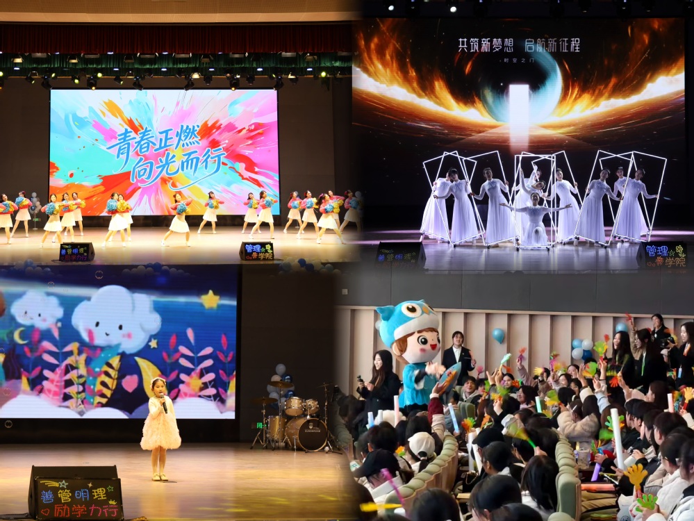 比赛中场,大学生艺术团带来创意舞蹈《时空之门》,奇幻的时空交错编排与变幻的灯光,为师生带来了多元的艺术体验。此外,特邀嘉宾马舒妤小朋友演唱《悬崖上的波妞》,轻快的旋律唤起了童年记忆。经激烈角逐,覃俐维、吴瑞等十名同学荣获 “十佳歌手” 称号,谢雨欣同学获 “最佳人气奖”。