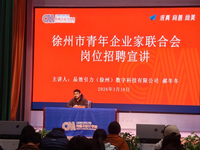 3月18日,传媒与设计学院“品效引力”专场招聘宣讲会在风华楼小报告厅举行。品效引力(徐州)数字科技有限公司总经理郝冬冬应邀来到现场,作为徐州青年企业家联合会会员企业向学院大三、大四学生开展企业宣讲与岗位推介,为学生搭建与行业一线企业面对面交流的平台。