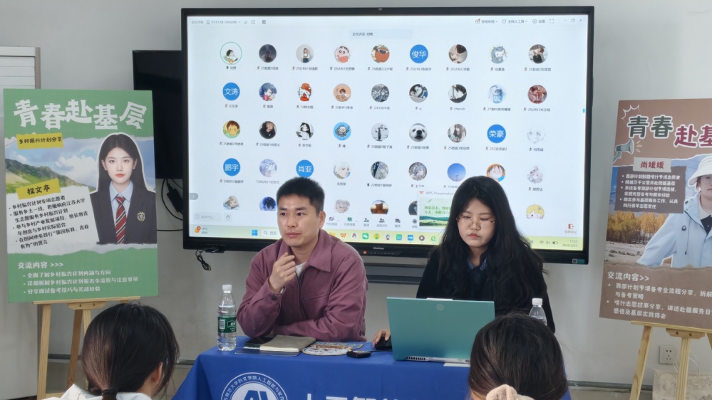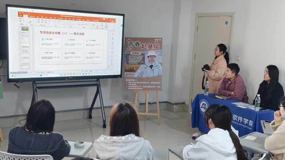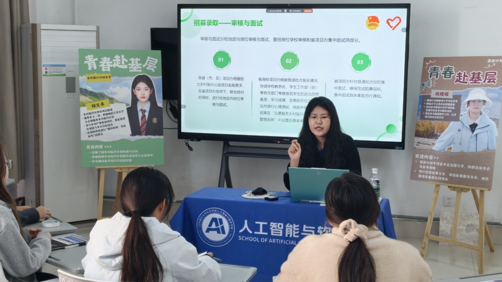 为深入推进就业引航工作,引导青年学子树立正确就业观、成才观,鼓励广大青年到基层一线建功立业,3月21日下午,人工智能与软件学院分团委在求真书院研讨室举办“青春赴基层建功新时代”西部计划、乡村振兴计划分享会。西部计划志愿者尚媛媛、乡村振兴计划志愿者权文亭受邀进行主题分享,辅导员高犇及200余名学生线上线下同步参加本次活动。