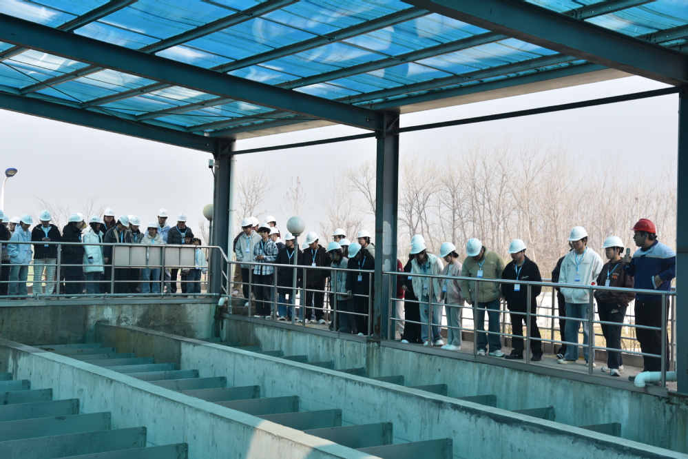 3月21日,学院师生走进徐州市邳州粤海水务有限责任公司,开展“知水情懂工艺 惜水源护家园”研学活动。在水厂工作人员的带领下,师生们先后探访了沉淀池、砂滤池、清水池等核心净水工艺设施,直观了解了原水转化为饮用水的全流程。现场演示环节,讲解员借助小型实验装置,生动直观演示了浑浊水经沉淀变清的过程,让同学们深入了解水处理的科学原理。