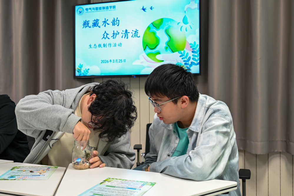 3月25日,“瓶藏水韵 众护清流”生态瓶制作活动在精工楼407智慧教室举行。活动现场,同学们以瓶为器,以沙为底,以草为景,精心构建起一座座微型水生态系统。一沙一草间,尽显水生态的灵动与平衡,同学们在动手实践中,深刻认识到了水资源保护的重要意义。