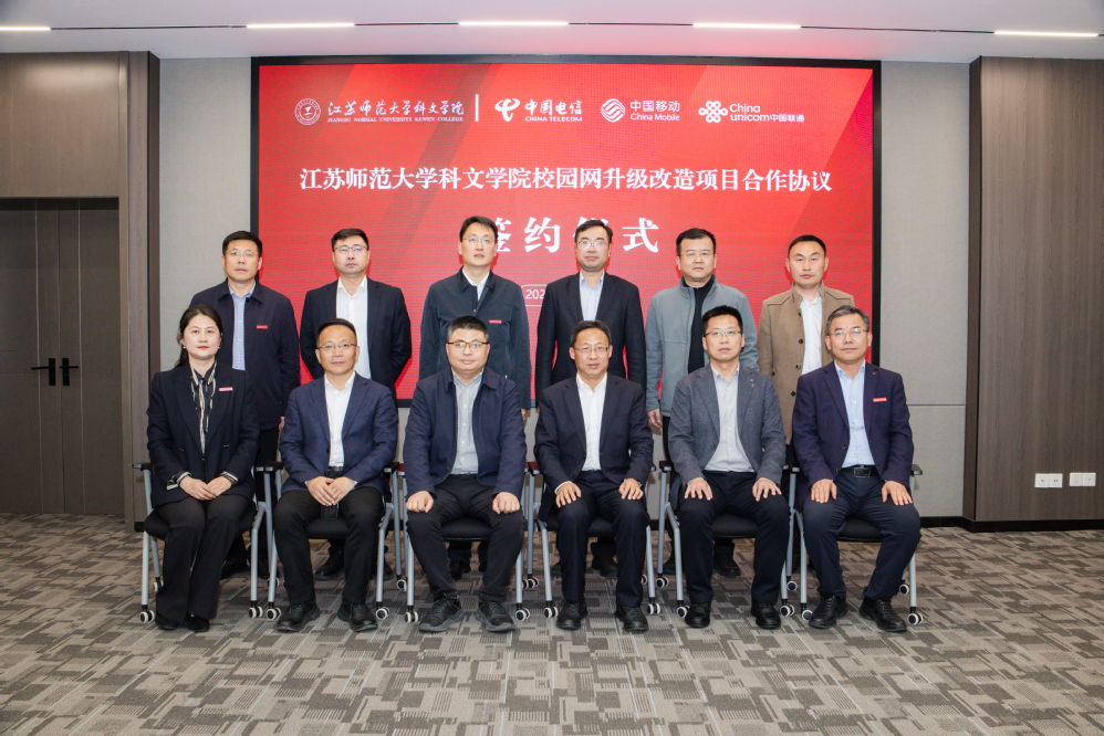 3月25日,我院与徐州电信、移动、联通三家运营商举行校园网升级改造合作协议签约仪式,江苏师范大学党委常委、副校长、科文学院理事长朱国军,院长张立荣、院党委书记刘晓莲,中国电信徐州分公司总经理燕宪宏、副总经理乔飞,中国移动徐州分公司总经理许兴盛、副总经理吴浩,中国联通徐州分公司总经理范敬波、副总经理张明刚,学院相关领导、部门负责人以及三家运营商代表等参加了签约仪式。签约仪式由刘晓莲主持。