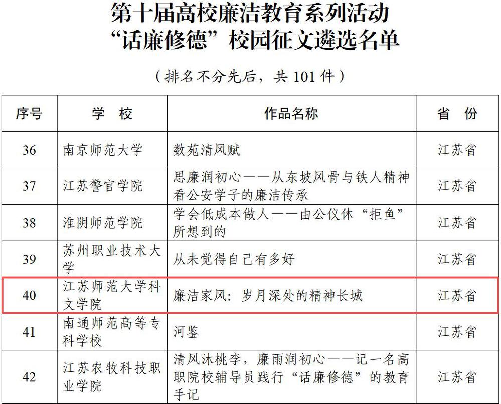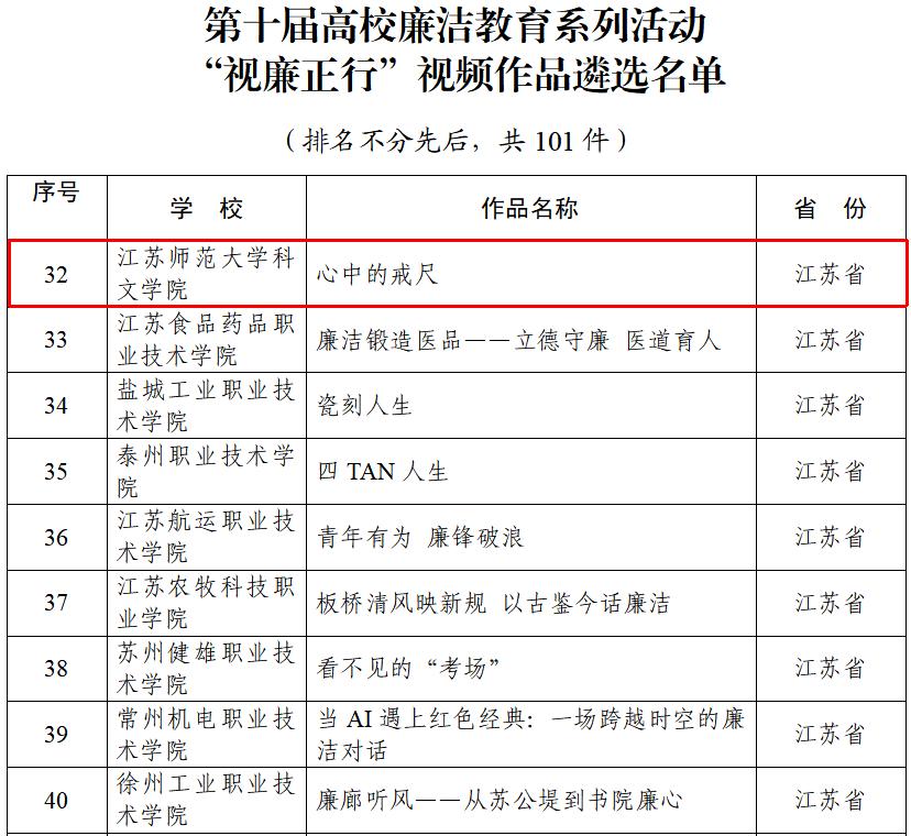 近日,教育部公布第十届高校廉洁教育系列活动评选结果。经学院遴选推荐、省教育厅择优报送、教育部组织专家评审,学院共有两件作品成功入选。传媒与设计学院杨列宁、蔺超及融媒体中心李耀老师创作的视频作品《心中的戒尺》入选“视廉正行”遴选名单;管理学院张桃老师的征文作品《廉洁家风:岁月深处的精神长城》入选“话廉修德”遴选名单。