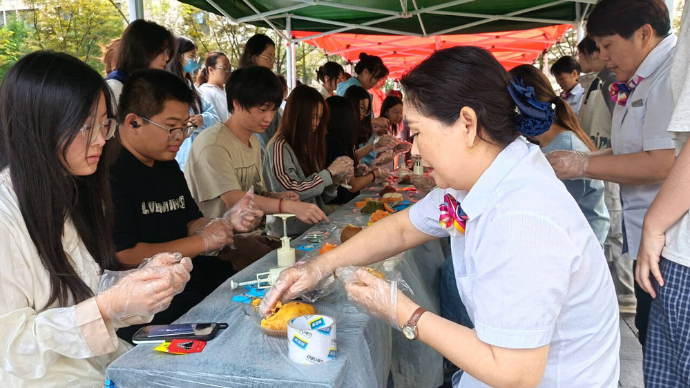 游园会现场布置雅致温馨,设有套圈、投壶、猜灯谜、做花灯、手工制作月饼等活动,吸引了众多同学的积极参与。趣味投壶与套圈游戏每每出现神射手都引发同学们阵阵欢呼;猜灯谜区域人头攒动,同学们或凝神思考,或热烈交流,为猜出正确答案而雀跃;手工灯笼、手工月饼制作区内,同学们在老师、宿管阿姨及物业工作人员的指导下,拆折、编织、拼装、点亮,揉面、裹馅、压模、装盒,每一个步骤都承载着对团圆的美好祈愿。现场欢声笑语不断,节日氛围浓厚。