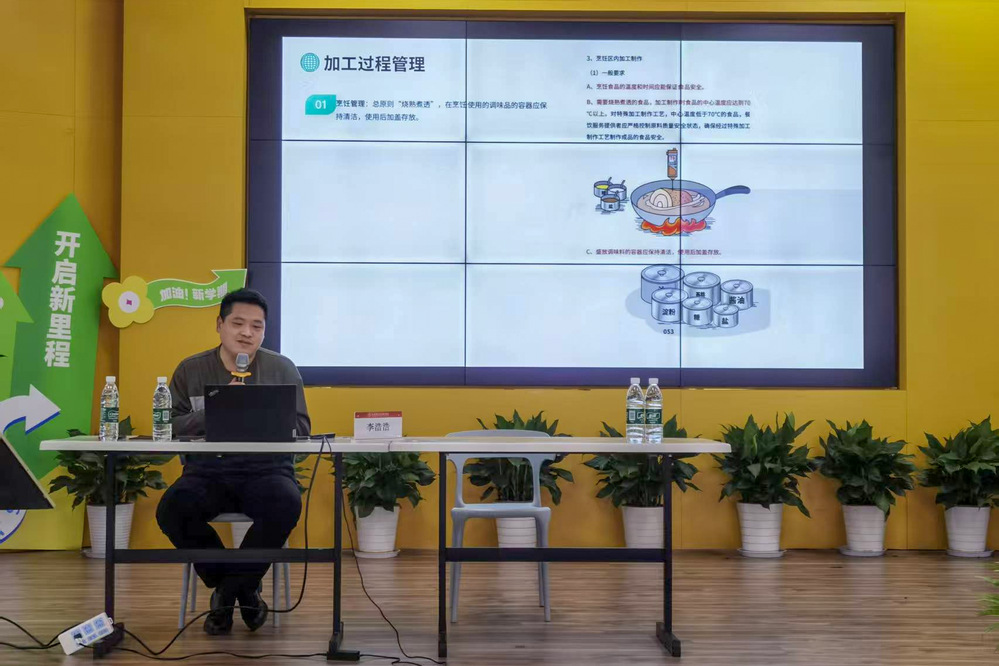 李浩浩从食品安全法律法规、食品监管法律法规、食品安全基础知识、食品安全标准、食品安全风险管理与突发事件应急管理、食品安全过程控制等方面系统讲解食品安全的重要性,结合校园食品安全典型案件及警示宣传教育记录片,详细讲解食品安全事故的危险性,重点分析了目前影响校园餐饮食品安全的各项风险因素,并结合学院实际,提出要强化全链条监管,严防外卖风险,严守安全底线的建议。他指出,餐饮从业人员要不断提高自身的业务能力和管理水平,共同参与食品安全治理,守护校园食品安全。