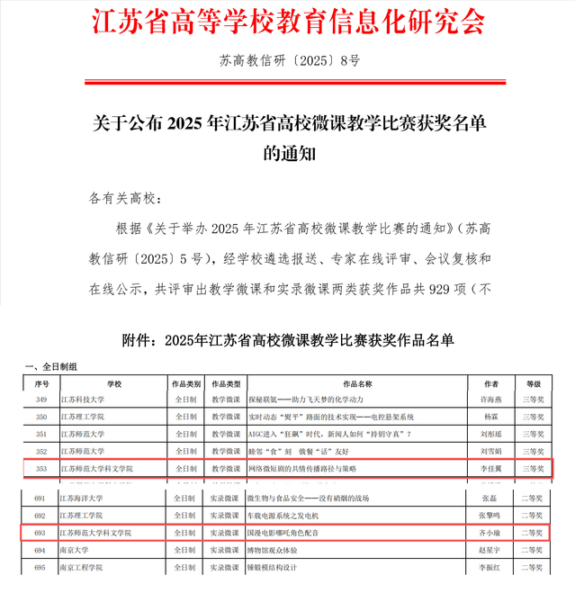 在2025年江苏省高校微课教学比赛中,齐小瑜老师的《国漫电影哪吒角色配音》获实录微课二等奖,李佳翼老师的《网络微短剧的共情传播路径与策略》获教学微课三等奖。本次比赛由江苏省高等学校教育技术研究会主办,全省共152所院校参与,竞争激烈。
