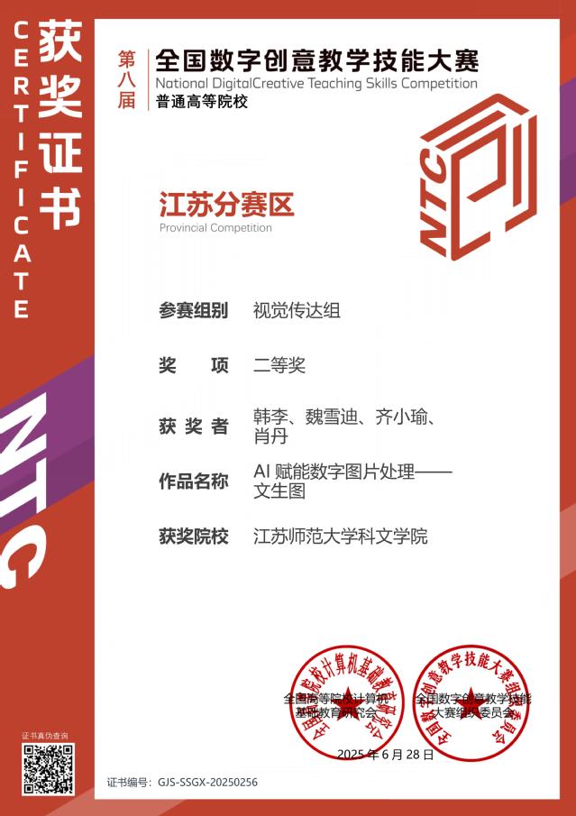 同期,在第8届全国数字创意教学技能大赛中,韩李、魏雪迪、齐小瑜、肖丹的作品《AI赋能数字图片处理——文生图》获江苏省赛二等奖;齐小瑜、韩李、焦艳丽、吴霜的作品《影视剧方言配音》获江苏省赛三等奖、国赛二等奖。此次比赛参赛作品总计4581件,参赛院校共574所,参赛教师5620人。