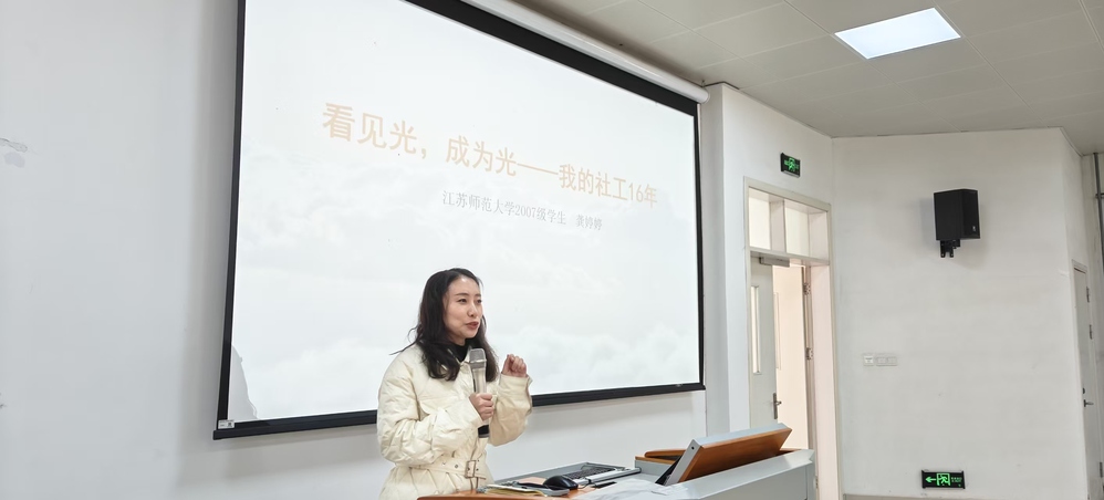 全国专业社会工作领军人才、无锡市锡山区乐助社工事务所理事长、江苏师范大学社会工作专业2011届校友龚婷婷,在博学楼作了《看见光,成为光——我的社工16年》专题讲座,讲座由党总支书记张海英主持,江苏师范大学公共管理与社会学院社会学系主任张俊明应邀出席。龚婷婷以自身十六年社工从业经历为脉络,从初心萌芽、专业求索到实践深耕,生动讲述了从高校学子到行业骨干的成长历程,结合社区治理、公益服务等一线实务案例,深入解析社会工作专业的实践价值与发展趋势,更传递了深耕公益、以行践善的职业初心。在互动环节,她耐心解答同学们关于专业学习、实务开展、职业规划等方面的困惑,为社工专业学子明晰了成长发展路径。张俊明在总结中勉励同学们以优秀校友为榜样,将理论知识与社会实践深度融合,努力成为适应数智时代发展的复合型社会工作人才。