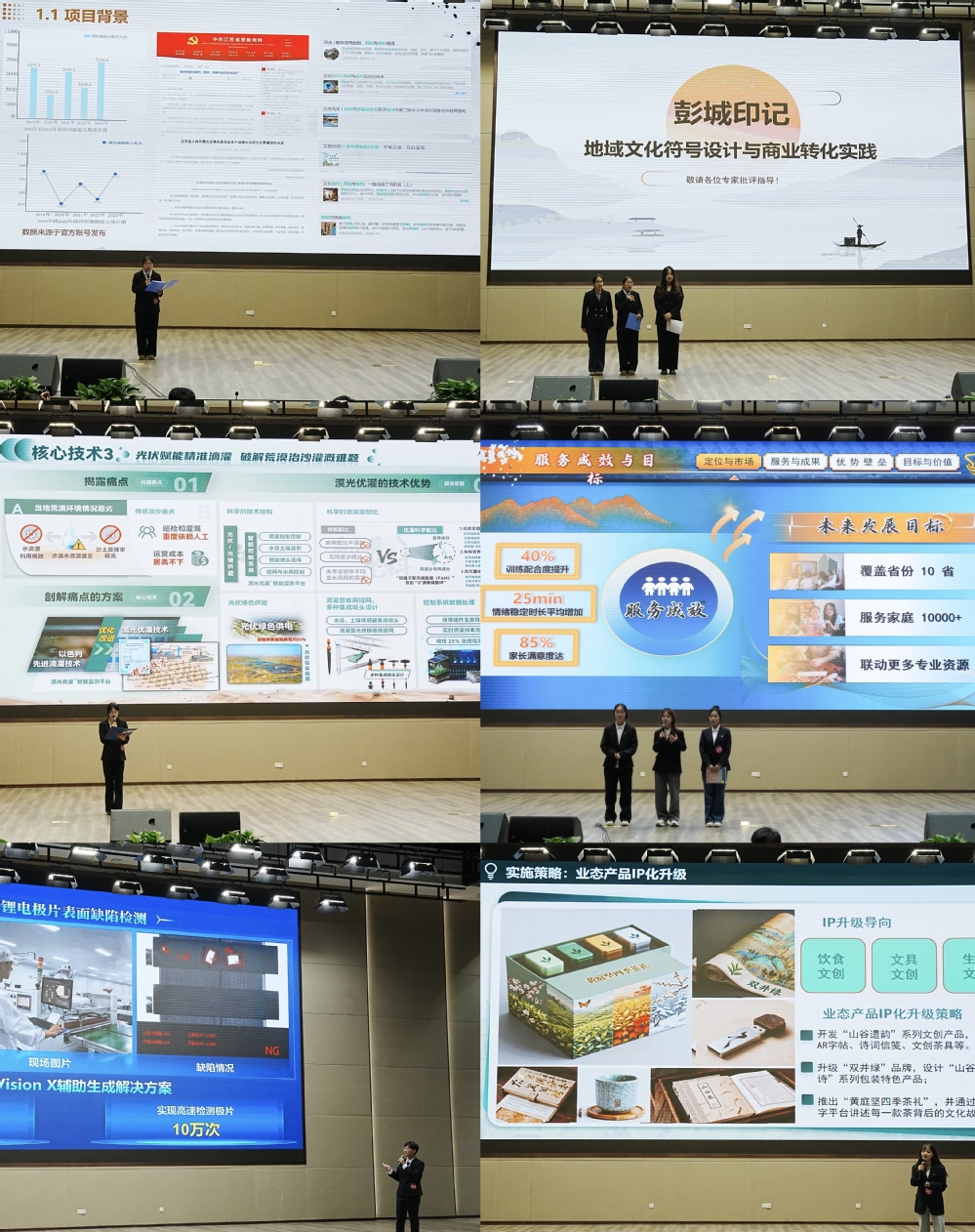 决赛采用“项目汇报+现场答辩”形式,各团队按要求在展示项目核心技术、市场前景与社会价值,并沉着应答评委关于技术可行性、商业模式等方面的提问。评委从创新性、实践性等维度综合评审,结合行业前沿与政策导向,提出了技术迭代、成本控制、团队协作等方面的优化建议。